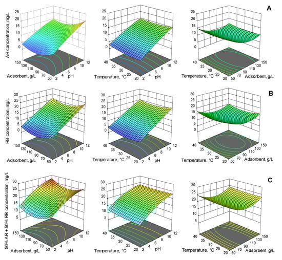 As shown in Table 2, the values of lack of fit for all three dyes systems indicate the suitability of the obtained mathematical equations. In the case of the terms, a low p-value suggests that the specific terms are significant. For AR and RB single systems, the pH and adsorbent dose had the most important impact while, in the case of the binary dye system, it seems that the pH had the greatest influence on the retention of the pollutants on the adsorbent surface.