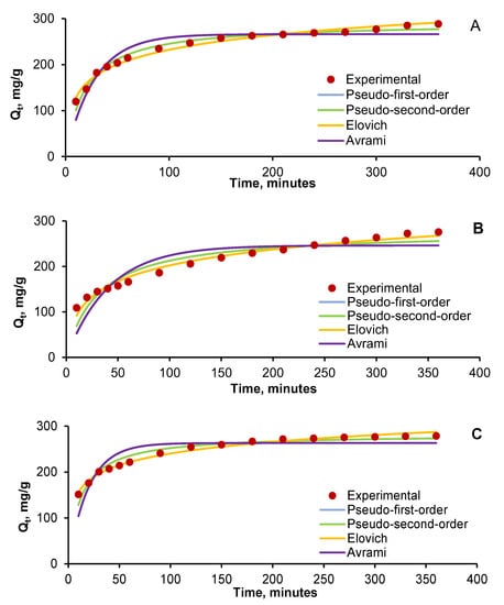 Different known kinetic models, namely pseudo-first-order, pseudo-second-order, Elovich, and Avrami, were tested and their accuracy evaluated. The first of the mentioned models can estimate the equilibrium time and quantity of the adsorbed pollutant by determining the time-scaling factor []. The pseudo-second-order kinetic model states that adsorption is based on chemical relations which take place between the adsorbate and the adsorbent surface. Parameters such as initial contaminant concentration, enthalpy, and entropy changes must be considered since they have a major impact on the adsorption []. There are studies specifying that, for high initial concentrations, the pseudo-first-order model is more suitable to express the adsorption kinetics, while the pseudo-second-order equation is recommended for defining the adsorption conduct at low concentrations [,]. The Elovich equation hypothesis is related to the fact that the chemical mechanism led the process, and is appropriate for situations including adsorbents with heterogeneous surfaces []. The Avrami kinetic model proposes that the reaction between the adsorbate and adsorbent occurs at the active sites surface. One of its factors gives details on the changes in the adsorption mechanisms as a function of time and temperature [].