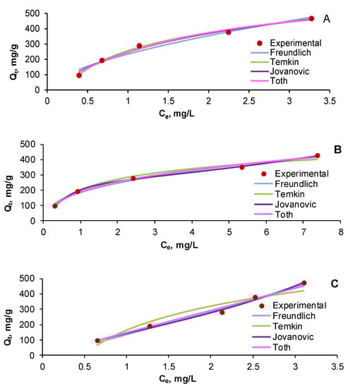 In the present work, three isotherm models with two parameters (Langmuir, Freundlich, and Temkin) and two isotherm models with three parameters (Jovanovic-multilayer and Toth) were compared to the registered results. Langmuir isotherm characterizes the adsorption happening on adsorbent homogeneous sites. It suggests that: (i) a material possessing adsorption properties has a limited adsorption capacity; (ii) the active sites of the adsorbent are identical and can accommodate only one adsorbate molecule; (iii) there are no interactions between the retained molecules []. Freundlich isotherm is useful in the situation of adsorbents with heterogeneous surfaces, which retain high amounts of contaminants []. The Temkin equation analyses the interactions between the adsorbent and the molecule to be adsorbed. It is based on the supposition that the molecules adsorption heat diminishes in a linear mode and that the binding energies are uniformly distributed []. The Jovanovic-multilayer isotherm model refers to physical adsorption and implies that the adsorbent surface which is not occupied by the target compound will reduce proportionally with the decrease in the power of the compound partial pressure []. The Toth isotherm provides information for submonolayer coverage, its theory relying on the fact that the materials with heterogeneous surfaces are able to adsorb low-to-high concentrations of pollutants from aqueous media [].