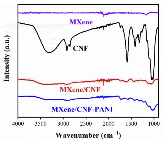 FTIR spectra of CNFs, MXene, MXene/CNF aerogel films and MXene/CNF–PANI aerogel films.