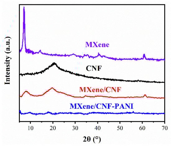 XRD patterns of CNFs, MXene, MXene/CNF aerogel films and MXene/CNF–PANI aerogel films.