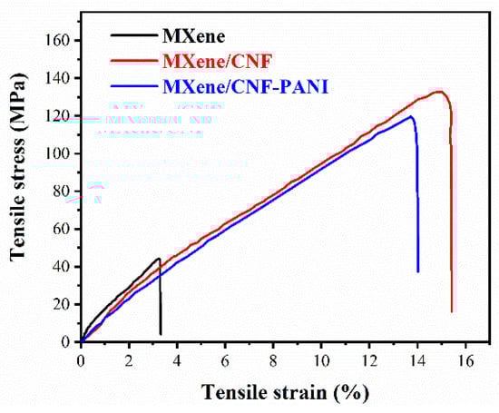 Tensile stress–strain curves of MXene, MXene/CNF aerogel films and MXene/CNF–PANI aerogel films.