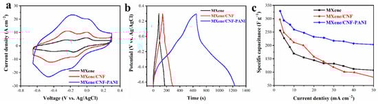 (a) CV curves, (b) GCD curves and (c) specific capacitance of MXene films, MXene/CNF aerogel films and MXene/CNF–PANI aerogel films.