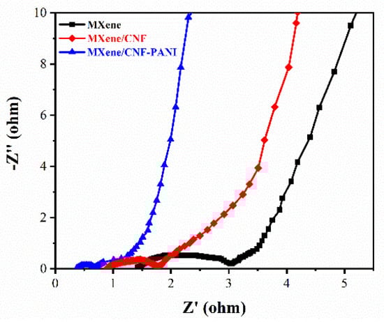 Nyquist curves of MXene films, MXene/CNF aerogel films and MXene/CNF–PANI aerogel films.