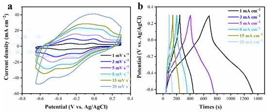 To demonstrate the effectiveness of this structural design for aerogel films, CV curves of the MXene/CNF–PANI aerogel films were recorded at varying scan rates from 1 to 20 mV s−1 (Figure 7a). At low scan rates, redox peaks appeared in the CV curves, which might be attributed to the special morphological features of the MXene/CNF–PANI aerogel films facilitating the protonation of the oxygen functional groups at positive and negative potential sites. As shown in Figure 7b, the charge/discharge profiles in a symmetric state reflect the nearly 100% Coulombic efficiency of the MXene/CNF–PANI aerogel films, indicating the occurrence of reversible redox reactions in the electrode. According to the results calculated from the GCD curves (Figure 5c), the MXene/CNF–PANI aerogel films showed high capacitive properties, i.e., 327 F g−1 at 3 mA cm−2 and 203 F g−1 at 50 mA cm−2, indicating that the MXene/CNF–PANI aerogel films exhibited good ion transport ability and that the three-dimensional structure design of MXene was useful and efficient.