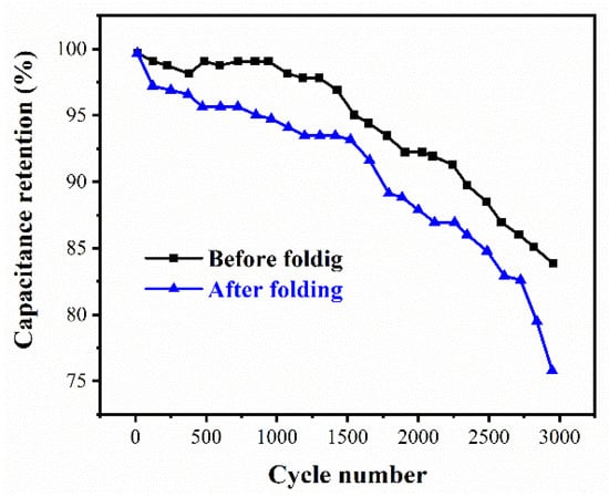 To evaluate the applicability of the MXene/CNF–PANI aerogel films, 3000 charge/discharge cycles were performed at a current density of 50 mA cm−2 (Figure 8). The combination of CNFs and PANI prevented the stacking of MXene and increased the film toughness, whereas the resistance was not increased, resulting in a capacitance retention of 84.1% after 3000 charge/discharge cycles. Furthermore, a capacitance retention of 71.6% was obtained after subjecting the MXene/CNF–PANI aerogel films to 500 folding cycles at the same charge/discharge current density, indicating that the electrode material had excellent flexibility for practical applications [40]. The comprehensive performance of MXene/CNF–PANI aerogel films could be shown through Table 1, and the applicability of MXene/CNF–PANI aerogel films was shown through comparison.
