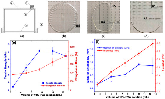 The schematic structure of the UND mold (a), the appearance of PVAHMs (b–d), and the effects of the PVA level on the mechanical properties and thickness of PVAHMs (e,f). (a) 1—Cup body; 2—nanopore filter membrane; 3—fixing flange ring; 4—hole of sample feeding; 5—rubber plug. (b–d) Images of a PVA membrane in semi-dry, dry, and swollen states in water at equilibrium (24 h); the size of the small squares in the background of figures is 10 mm × 10 mm. (e,f) The evolution of some of the mechanical properties of the PVAHM in the semi-dry state (30 mm × 5 mm rectangular strips) as a function of the initial volume of the PVA solution used for membrane preparation (n = 5).