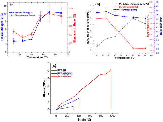 (a,b) The effects of temperature on the physicomechanical properties of PVAHMs (n = 5) and (c) the stress–strain curves of PVAEM prepared at 25 °C and PVAHMs prepared at 25 °C and 70 °C (the PVA hydrogel film was prepared from 5 mL of 10% PVA aqueous solution; strips of 30 mm × 5 mm in the dry state were used after rehydration as testing samples at 45% RH; average thickness of the strips ~0.55 mm).