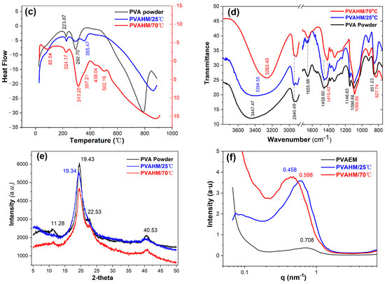 (a–c) TG, DTG, and DSC thermograms; (d) FTIR spectra; (e) XRD diffractograms of pure PVA powder, PVAHM/25 °C, and PVAHM/70 °C; and (f) SAXS patterns of PVAEM, PVAHM/25 °C, and PVAHM/70 °C.