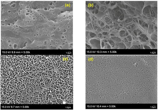 To investigate the microstructural morphology of PVAHM hydrogel membranes obtained via UND, two control samples were prepared separately according to the previously reported methods [25,26,27]: a PVA cast film (PVAEM) and a film produced using five freeze–thaw cycles (PVAFT). The micromorphology of the fracture surfaces and the cross-sections of the PVA films formed using different preparation methods were observed in detail at an SEM magnification of 5000× (Figure 4). Figure 4a shows the cross-section of the PVAEM, which had a dense structure but was very thin. It had non-uniformly distributed pore sizes in the range of 0.10–1.4 μm, with a mean pore size of about 0.4 μm and a porosity of about 13.22% (Table 2). The mechanical properties of PVAEM after allowing it to swell in water were very poor (it was quite a brittle material). However, the PVAFT (Figure 4b) exhibited good mechanical properties after swelling in water, with high elasticity, a high swelling ratio, and high water absorption capacity. The porous network structure was observed at a magnification of 5000×, revealing that the pore sizes varied greatly, ranging from 0.54 to 4.29 μm, and its distribution was not uniform. The average pore size was 3.43 μm, with a porosity rate of 80.45 %.