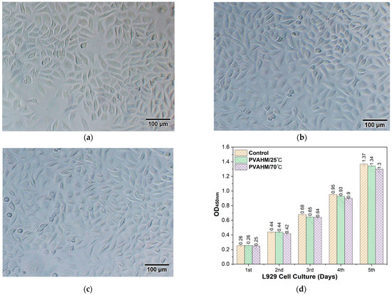 Adherence, colonization, and growth of murine L929 cells on two PVAHMs on the 5th day: (a) control; (b) PVAHM/25 °C; (c) PVAHM/70 °C; (d) cells status and growth diagram of L929 cells on PVAHM for 1~5 days (n = 3).