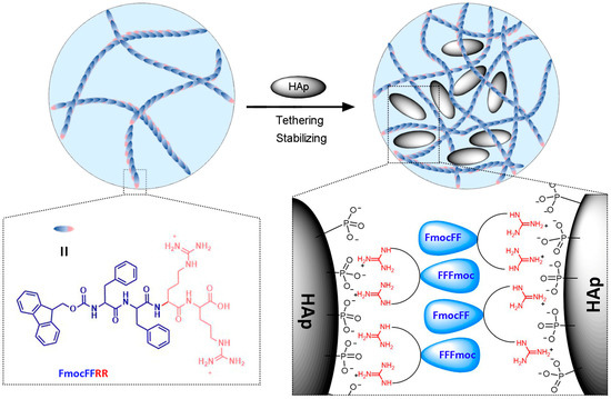 Despite the regulatory effects of both positively charged arginine and negatively charged aspartic acid or glutamic acid on HAp mineralization [33,34], recent material-design for HAp-supporting scaffolds focused on polycarboxylate-rich scaffold materials as HAp capping [10,35]. We demonstrated an arginine-containing peptide as an alternative to HAp-stabilizing materials. The HAp-anchorable peptide FmocFFRR was designed by tailoring an arginine residue to a self-assembling building block FmocFF. Anchoring FmocFFRR on the HAp surface through electrostatic guanidine–phosphate interaction facilitated the self-assembly of FmocFFRR, due to the neutralization of charge repulsion, the reduction of intermolecular distance between building blocks, and the tether of self-assembling filaments into the dense fibrous network. On the other hand, FmocFFRR assembling on the nanosized HAp surface reduced its surface energy and stabilized its dispersion in the scaffold.