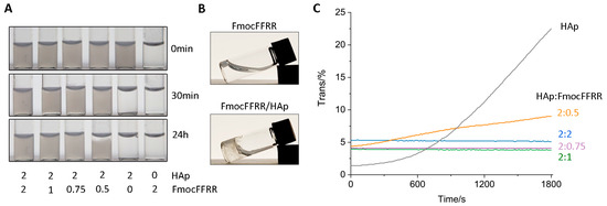 (A) Optical images of 2 mg/mL HAp particles dispersed in FmocFFRR solution in ddH2O at different concentrations (0, 0.5, 0.75, 1.0, 2.0 mg/mL) for 0 min, 30 min, or 24 h. (B) Optical images of 2 mg/mL FmocFFRR in the absence or presence of HAp particles (4 mg/mL) in ddH2O. (C) Transmittance curves of 2 mg/mL HAp dispersed in ddH2O or in FmocFFRR assemblies at 0.5, 0.75, 1.0, or 2.0 mg/mL over a 30 min period. Transmittance was measured at 600 nm.