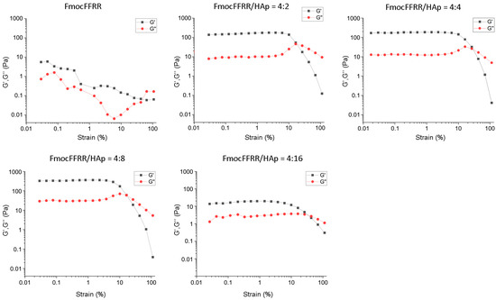 Strain amplitude sweep tests of 4 mg/mL FmocFFRR containing 0, 2, 4, 8, or 16 mg/mL HAp particles at a fixed angular frequency (1.0 rad/s) at room temperature.