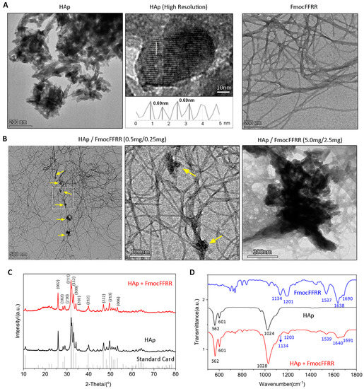 After formulating the compositions of the tough HAp/FmocFFRR hydrogel, we examined their microstructures using transmission electron microscopy (TEM). As shown in Figure 4A, HAp particles used in these tests showed nanorod-like structures. High-resolution TEM image revealed the crystalline structure of HAp nanoparticles with a lamellar distance of 0.69 nm, which was attributed to the crystal lattice c parameter [27,28]. FmocFFRR self-assembled into nanofibers with a diameter of 4 nm. When FmocFFRR was mixed with HAp, it formed a dense fibrous network. At a low concentration of mixed gel (HAp/FmocFFRR = 0.50/0.25, mg/mL), we could clearly observe individual HAp particles surrounded by the peptide assembling nanofibers (Figure 4B), indicating peptide bound to HAp. HAp clustering was observed at a high concentration of mixed gel (HAp/FmocFFRR = 5.0/2.5, mg/mL). However, the edge of HAp clusters was fused with fibrous bundles. These observations suggested HAp tethered FmocFFRR assembling nanofibers, which in turn stabilized HAp dispersion. X-ray diffraction (XRD) analysis (Figure 4C) demonstrated that the FmocFFRR/HAp mixture showed a similar XRD pattern compared with free HAp particles. This result suggested that the tether of FmocFFRR on the HAp surface did not affect its crystalline structure.
