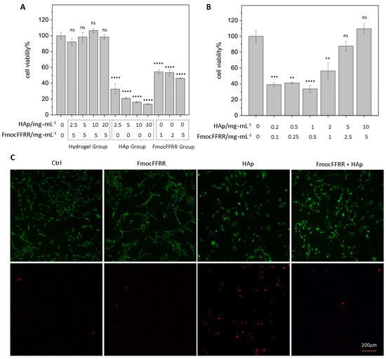 (A) MC3T3-E1 cell suspensions were mixed with freshly prepared FmocFFRR/HAp mixture for in situ gelations (hydrogel group), with free HAp particles (HAp group), or with FmocFFRR assemblies (FmocFFRR group). For the controlled groups, MC3T3-E1 cell suspensions were mixed with culture media. Cells were allowed for cultured for another 48 h and the cell viability was evaluated. (B) Cell viability of MC3T3-E1 cells after culturing in FmocFFRR/HAp hydrogels at different concentrations with a fixed 1:2 weight ratio. ns: non-significant; **: p < 0.01; ***: p < 0.001; ****: p < 0.0001. (C) Live-dead staining of MC3T3-E1 cells after culturing in FmocFFRR/HAp (5.0/10.0 mg/mL) hydrogel, or treated with free HAp particles (10.0 mg/mL), FmocFFRR assemblies (5.0 mg/mL) for 48 h. The controlled cells were seeded on a tissue-culture plate. Green channels indicated live cells; red channels indicated dead cells, respectively.