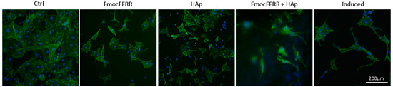Morphological analysis of MC3T3-E1 cells after culturing in FmocFFRR/HAp (5.0/10.0 mg/mL) hydrogel, free HAp particles (10.0 mg/mL), FmocFFRR assemblies (5.0 mg/mL), or treated with osteoinduction medium (Induced) for 5days. F-actin filaments were stained with Alexa Fluor 488-conjugated phalloidins, and nuclear were stained with DAPI (blue).