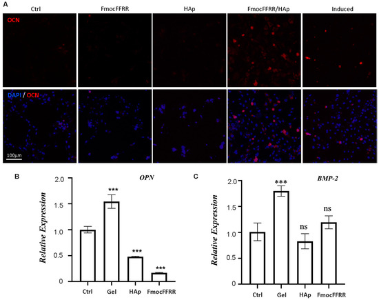 The RNA level of osteopontin (OPN) expression, another biomarker for late-stage osteoblast differentiation, was quantified by qRT-PCR. The results (Figure 7B) demonstrated that 3D culturing in hydrogel promoted the OPN level, while the treatment of HAp or FmocFFRR assembly reduced its expression. MC3T3-E1 cells cultured in hydrogel also exhibited increasing RNA levels of bone morphogenic protein 2 (BMP-2) (Figure 7C), which positively regulates osteogenesis processes [32]. Taking into consideration the morphological changes of preosteoblasts and the increasing level of both protein expressions and RNA expressions of osteoblast differentiation-related markers, we could conclude that FmocFFRR/HAp hydrogel capably supported 3D culturing of preosteoblasts, and promoted their osteoblast differentiation, exhibiting great potentials as a highly osteoinductive scaffold in bone regenerative engineering.