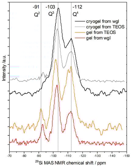 4 units mean a more compact structure for the elementary units, and this sample of TEOS was prepared in pure ethanol. The NMR spectra of the cryogels produced from TEOS in ethanol–water solvent or from wgl were very similar. In both spectra (