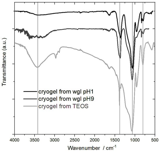 Figure 5). Regarding the intensity of these signals, most of the Si-OH groups were in the cryogel of TEOS. This is also verified by the intensity of the band (νSi-OH) at 952 cm