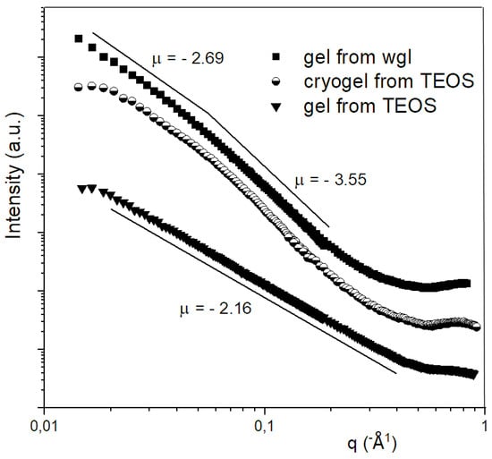 Figure 6); their surface fractal dimension was 6 − 3.55 = 2.45, which indicates compact particles with a rough surface. The simple interpretation of the fractal theory for the Porod-region was not carried out for the SAXS data of the cryogels owing to the “S” shape of the curve. The SAXS curve of the cryogel could be evaluated by Freltoft approximation results in unit sizes of 40–50 nm in the cryogel prepared from TEOS [