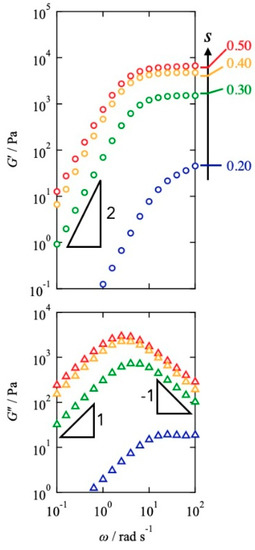 Figure 1 shows the results of dynamic viscoelastic measurements for the Tetra-PEG slimes with various mixing fractions at 30 °C. G′ showed the plateau region and the power law G′~ω2, whereas G″ demonstrated the symmetric power law behaviors G″~ω and G″~ω−1 at high and low frequencies, respectively. These characteristics agree well with the prediction of the Maxwellian model, which suggests that viscoelastic relaxation occurs via a unique process. It should be noted that the upturn at high frequencies was observed in s = 0.20, which is attributed to the Rouse mode of the dangling chains. As the values of s decreased from 0.50, the plateau level of G′ decreased, and the peak of G″ shifted to high frequencies. In Figure S1 in the Supplementary Materials, the viscoelasticity of the Alexa-labeled and neat samples overlapped each other, indicating that the effect of the fluorescence modification on the rheological property is negligible.