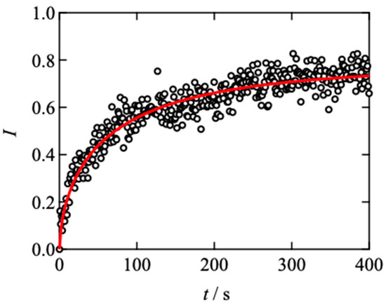 Figure 3 shows the time development of the fluorescent intensity for the Tetra-PEG slimes in a FRAP measurement. By the laser irradiation at t = 0 s, the intensity was reduced stepwise. After the irradiation, the intensity recovered with time and reached the plateau value at approximately 400 s. Here, the fluorescent intensity (I) was normalized by the background and bleaching intensities. The recovery curve is fitted by the Kohlrausch-Williams-Watts (KWW) type equation as: