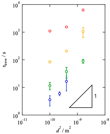 Figure 4 shows the estimated τKWW against d2. The linear relationship between τKWW and d2 was observed, indicating that the fluorescence recovery is primarily attributed to the Fickian diffusion of molecules, and the chemical interconversion is negligible. It should be noted that the data in the smallest area in s = 0.5 deviated from the linear relationship due to the non-Fickian (anomalous) diffusion in transient networks [5,33,34]. In the discussion below, we utilized the data showing the linear relationship to estimate the translational diffusion coefficient.