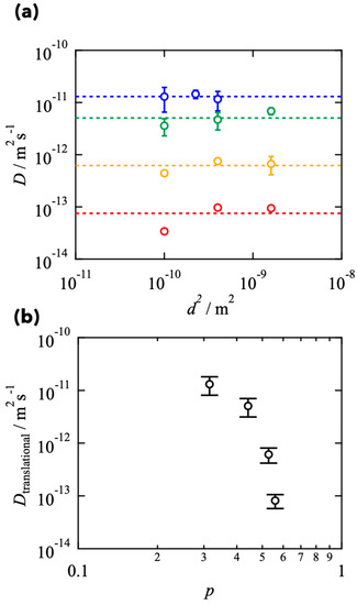 Figure 5a shows D as a function of S. At the large d2 region, D is almost independent of d2 and constant values, reflecting the translational diffusion in two-dimensional space. In the region where <τ> was independent of d2, the translational diffusion coefficient (Dtranslational) is defined (represented by dashed lines). The estimated Dtranslational is plotted against p in Figure 5b. Dtranslational decreased with increasing p in the semi-logarithmic plot, suggesting the collision between stickers restricts the polymer dynamics. This tendency was observed in the previous reports [3,5,33,34], and is quantitatively consistent with the Sticky Rouse model [36].