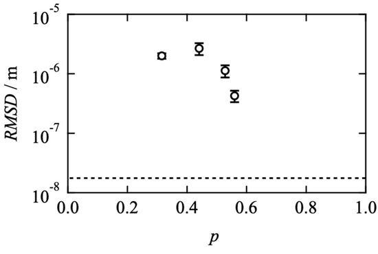 Figure 6 shows the p-dependence of RMSD. In the figure, the dashed line represents the gyration radius of a Tetra-PEG (≈aNν; a is the Kuhn length of polyethylene glycol (≈0.65 nm [37,38,39,40]), N is the Kuhn segment number, ν is the excluded volume exponent in good solvent (≈0.57)). RMSD is an order of 10−6 m and approx. 100 times larger than the gyration radius even in the Tetra-PEG slime with the controlled network structures. This significant difference indicates that the viscoelastic relaxation does not proceed through the diffusive motion of each prepolymer. In this experimental system, the equilibrium connectivity is up to 0.6. Therefore, a mobile sol component in which not all arms are connected to the percolated network exists. It is suggested that the FRAP measurement preferentially detects this mobile component.