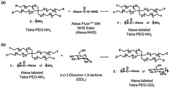 Amine-terminated tetra-armed polyethylene glycol (tetra-PEG-NH2) (Mw = 2.0 × 104 g mol−1) was purchased from SINOPEG BIOTECH Co., Ltd. (Xiamen, China), and its end groups were modified with of 4-carboxy-3-fluorophenylboronic acid (FPBA). The details were reported previously [29]. On the other hand, we synthesized the Tetra-PEG-D-(+)-glucono-1,5-lactone (GDL) partially modified with Alexa Fluor 594 (Alexa). The Tetra-PEG-NH2 was dissolved in methanol at a concentration of 50 g L−1. Separately, Alexa Fluor™ 594 NHS ester (succinimidyl ester) (Alexa-NHS), purchased from Thermo Fisher SCIENTIFIC (Tokyo, Japan), was dissolved in super-dehydrated dimethyl sulfoxide at the concentration of 1 mg/mL. Compared to the molar amount of the amine end group, we added 0.001 times the amount of Alexa-NHS and stirred the mixture overnight at room temperature. Compared to the molar amount of the amine end group, we added 10 times the amount of D-(+)-glucono-1,5-lactone (GDL) and 20 times the amount of triethylamine and stirred the mixture for three days at 35 °C. The resultant solution was poured into a dialysis membrane (molecular weight cut-off: 3500 for 10,000 g mol−1) and dialyzed for two days with methanol and water. After passing through a syringe filter (0.45 μm), the solutions were collected and freeze-dried. The synthesis scheme is shown in Figure 7. 1H-NMR was used to confirm that the synthesis was complete. The fluorometer confirmed that the modification degree of the Alexa was 0.0444% (shown in Figure S2).