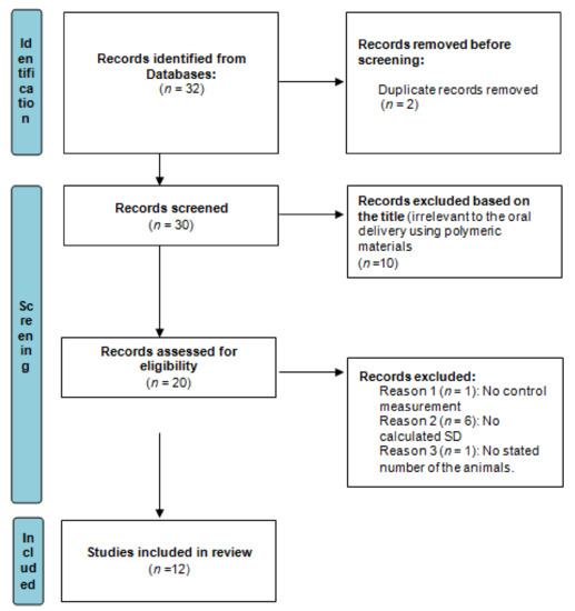The oral route remains the most common route of drug administration and one of the most convenient and acceptable to patients, due to its non-invasiveness and ease of administration [1]. It is also preferred by the pharmaceutical industry due to the feasibility of its mass production [2]. Several attempts have been made in order to enhance the bioavailability of orally administered drugs and increase their absorption. Encapsulating the drugs in different lipid and polymeric nanoparticles (NP) is one example of these attempts [3,4]. Moreover, the delivery of drugs in a controlled manner is currently a topic of great importance for both the industry and academia, due to its huge benefits for healthcare [5]. Recently, the use of lipid-based nano-carriers has shown proven superiority over the conventional formulations in augmenting the bioavailability of oral drugs, via a study using quantitative meta-analysis [6]. The close affinity of those carriers with the lipidic nature of intestinal cell membranes may have contributed to this outcome. Consequently, a logical question arises whether or not the use of polymeric nanoparticles increases the bioavailability of the aforementioned drugs, bearing in mind their different nature and more rigid matrices. From the pharmaceutical point of view, polymeric nanoparticles are of special interest as they are more stable than other lipidic nanocarriers, such as liposomes, and impart more protective effects to their internal cargo [7,8,9]. Furthermore, they are distinguished by their facile modulation regarding their size, hydrophobicity, and surface grafting and conjugation [10,11,12,13]. Accordingly, the same informatics tools of systematic reviewing and meta-analysis are utilized in this study to answer this question.
