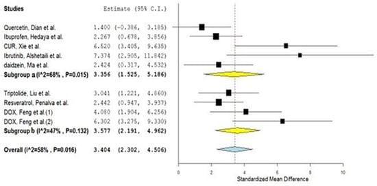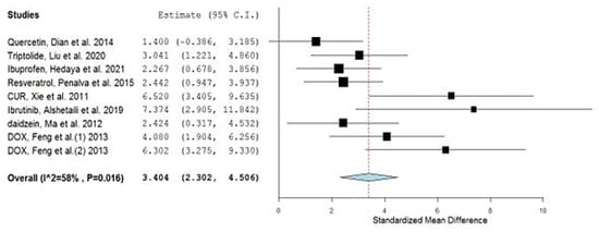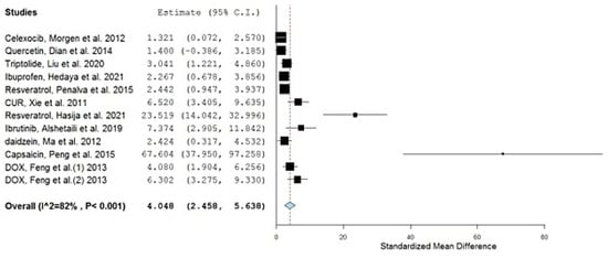 The variability in the kinds of animals used, their number, and the type of drugs and their dosages, in particular, have the most profound reflection on the weight of each study. Therefore, in an attempt to optimize this study regarding heterogeneity, the studies possessing the highest and lowest weights were excluded [41]; Morgen et al. (2012), Hasija et al. (2021), and Peng et al. (2015) (Table 2).