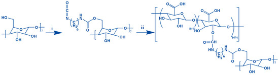 The formation of the Alg-CD schematic shows synthesis from the combination of CD-hexamethylene diisocyanate (i) and alginate (ii).