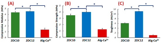 Mechanical properties of nanohybrid Alg-CD + Ad-GO hydrogels: (A) compressive modulus (at 80% strain), (B) compressive strength and (C) toughness of DC hydrogels (*: p < 0.05).