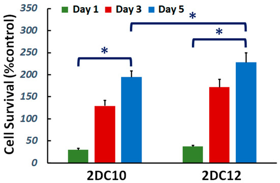 Hydrogel materials are appealing scaffolds for cell encapsulation because they have good biocompatibility and excellent permeability for oxygen, nutrients, and other water-soluble metabolites. One of the essential properties of hydrogels is their OP value. Interestingly, OP value is affected by interconnected pores and pore size. This may help the cells contained within the hydrogel to survive and grow [35]. According to Figure 6A, 2DC12 hydrogel with an OP value of 5.51 × 10−8 ± 0.01 cm3 m m−2 d−1 Pa−1 shows the excellent oxygen route. As more macromeres were added, the porosity of hydrogels increased, influencing the OP values of the hydrogels and improving the OP values (1.6-folds). Furthermore, higher oxygen solubility in hydrophilic hydrogels is thought to promote oxygen transport inside the hydrogels [36].