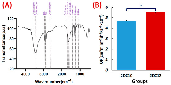 Characterisation of Alg-GO hydrogel: (A) FTIR spectrum of Alg-GO (2DC12) hydrogel. (B) The OP properties of 2DC10, and 2DC12 hydrogels (n = 3) (* p < 0.05).