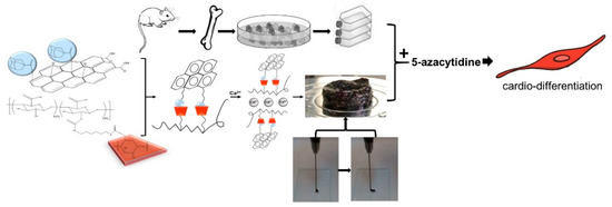 According to Figure 7, nanohybrid hydrogels were developed via GH interactions between Ad-GO and Alg-CD macromeres. Then, we incorporated Ca2+ within Alg-GO hydrogels to develop ionic cross-linked hydrogels. As a result, an injectable shear-thinning hydrogel with desirable rheological and mechanical properties for soft tissue engineering was generated [28]. The capacity of Alg-GO hydrogels for rMSCs encapsulation was then investigated. It was expected that rMSCs differentiate to myocytes via 5-azacytidine as a growth factor.