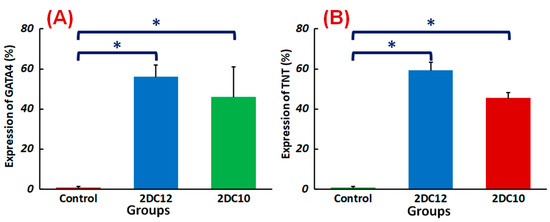Differentiation of rMSCs encapsulated Alg-GO hydrogels: quantified expressions of (A) GATA4 (%) and (B) TNT (%), measured after two weeks of culture (n = 3) (* p < 0.05).