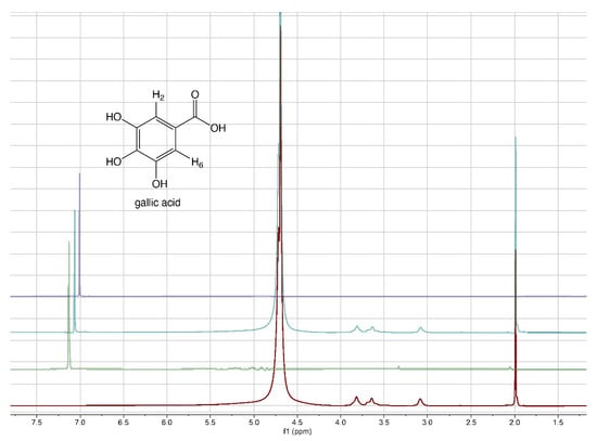 From literature data [], it emerged that the grafting efficiency of GA onto chitosan was, at the best studied conditions, equal to 285.9 mg GA/g chitosan, corresponding to 1680 mmol/kg. Other authors [] reported that the highest grafting degree, expressed as 88.5 mg of GA equivalents (GAE) per g of chitosan-GA (520 mmol/kg), was obtained when the mass ratio of GA to chitosan was 0.5:1. The comparison of the literature data with those reported in Table 2 reveals that the approach proposed here for the preparation of 3D chitosan–GA complexes is more efficient, other than rapid and ecofriendly, than previous methods based on grafting methodologies. To confirm the adsorption of GA into the 3D chitosan structure and assess the entrapped GA’s chemical stability, we recorded the 1H-NMR spectra of chitosan and GA before and after their mixing. To maximize the water solubility of chitosan and improve the quality of NMR spectra, we adjusted the pH of all NMR samples from 4.0 to 3.5. The water-suppressed NMR spectra of GA, 3D chitosan, and HL-3D chitosan-GA complex are showed in Figure 1. The proton NMR spectrum of the water-dissolved GA displayed one singlet signal attributable to the homotopic H2 and H6 aromatic protons resonating at 7.13 ppm (Figure 1, green spectrum). In the 3D chitosan-GA complex (Figure 1, cyan spectrum), we observed the GA characteristic aromatic singlet resonating at 7.06 ppm (upfield-shifted by 0.07 ppm). The remaining signals, all belonging to the 3D chitosan structure, were perfectly superimposable to those of the pure 3D chitosan recorded in the same conditions (Figure 1, red spectrum). Thus, the NMR analysis confirmed the successful incorporation of GA into the 3D chitosan structure, as well as the preservation of its redox state. Moreover, we recorded the NMR spectra of pure GA at pH 6.0 to also demonstrate the preservation of the GA structure at the pH that was used for the release kinetics study reported in Section 3.2. The resulting NMR spectrum, reported in purple in Figure 1, displayed the presence of a single singlet attributable to the homotopic H2 and H6 aromatic protons of GA, thus confirming the chemical stability of GA at pH 6.0.