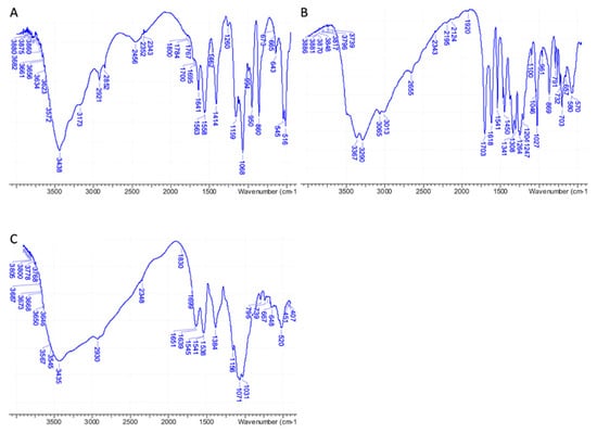 FT-IR spectra of pure 3D chitosan (A), GA (B), and ML-3D chitosan-GA complex (C).