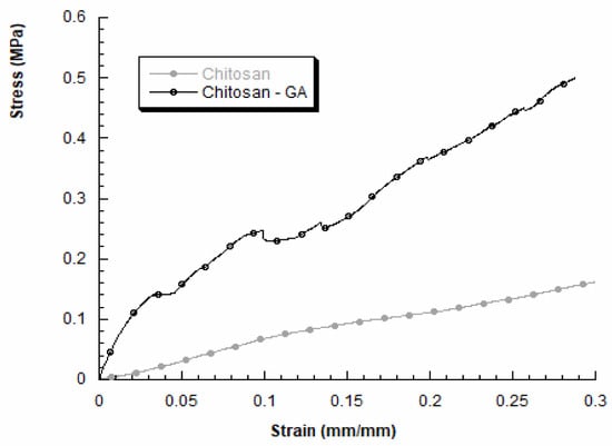 The adsorption of GA via the proposed methodology may lead to an improvement in the compressive modulus and the maximum stress (at 0.3 mm/mm). Anyway, the obtained results agree with previous works performed by other researchers, highlighting the dependence between the internal morphology and the mechanical behavior of freeze-dried chitosan samples [].