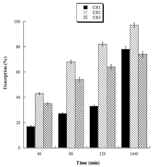With the aim to evaluate the best conditions for GA release, we carried out several experiments at different pH values (4.0, 5.0, 6.0, and 7.0). Four HL-3D chitosan-GA samples were prepared at pH 4.0 (the best loading pH value) and then treated with ultrapure water at different pH values as reported above. The concentration of GA desorbed after 24 h incubation from each 3D chitosan complex was determined by a UV analysis at 265 nm. The results, summarized in Figure 4, revealed that a pH ≥ 6.0 was required for the complete release of the adsorbed GA. Considering that pH 6.0 was determined as the best pH value for both the antioxidant activity and release of GA, we decided to perform the kinetic release study of GA from the 3D chitosan matrix at pH 6.0. To assess the influence of drying time on the release kinetics, three samples of HL-3D chitosan-GA were dried for 24 h (CH1), seven days (CH2), and 14 days (CH3) before assessing the amount of GA released at different time points (40, 90, 120, and 1440 min) following the addition of 10 mL of ultrapure water at pH 6.0. For CH1 sample, we observed an incomplete and nonlinear release of GA (Figure 5, black bars) characterized by a slow release in the first 120 min (33%) followed by a strong acceleration in the succeeding 22 h (78% release after 24 h). In the case of CH3, we observed an almost linear release kinetics along the monitored 24 h (Figure 5, squared bar). However, also in this latter case the percentage of GA released after 24 h was limited to 74%, probably due to the formation of crosslinking phenomena between 3D chitosan and GA. Finally, the CH2 sample, dried for seven days, displayed the best release kinetics, characterized by a linear behavior and an almost complete release at 24 h (Figure 5, diamond bar). Overall, the release kinetics study indicated that a drying time of seven days is the optimal compromise to achieve the complete and linear release of GA from the 3D chitosan matrix.