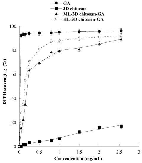 Scavenging activity against the DPPH radical of 3D chitosan, GA, ML-3D chitosan-GA, and HL-3D chitosan-GA at pH 3.5. The GA equivalent in ML- and HL-3D chitosan complex was 168.42 and 342.79 g kg−1, respectively. 3D-chitosan-GA samples were dried for seven days before measurements.