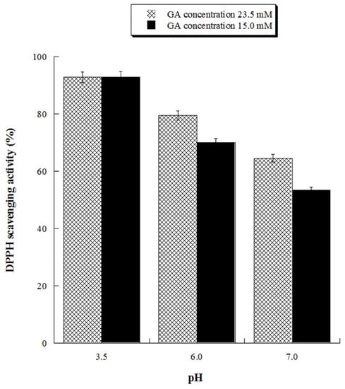 With the aim of assessing the antioxidant activity of GA at ecofriendly working conditions, we evaluated its antioxidant activity at neutral (pH 7.0) and close neutral pH (pH 6.0) for two different concentrations (15.0 and 23.5 mM). The results, reported in Figure 7, demonstrated that GA solutions possess significant antioxidant activity also at pH 6.0, reaching 80% DPPH inhibition at the highest tested GA concentration.