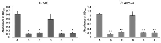 Effect of Chitosan (CS) and Gallic Acid (GA) on bacterial growth. A: non treated, B: HL-3D chitosan-GA 1 mg/mL, C: HL-3D chitosan-GA 0.5 mg/mL, D: CS 10 mg/mL, E: GA 1 mg/mL, F: GA 0.5 mg/mL. The mean ± SD for at least four replicates is shown. Statistical significances between treated bacteria versus untreated * p < 0.001, ** p < 0.0001.