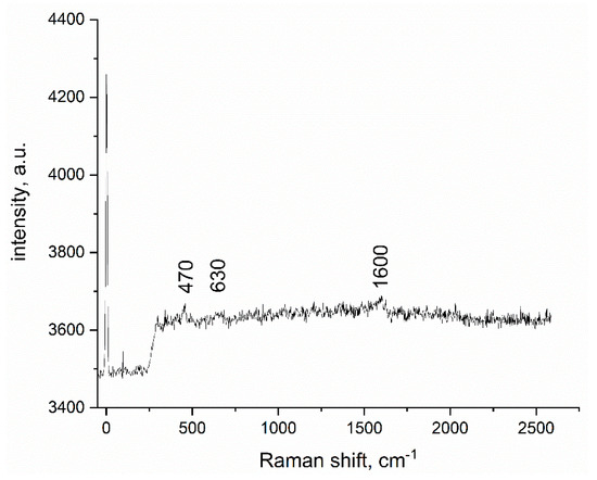 In order to be able to observe vibrational and rotational modes, along with some other low frequency movements, Raman spectroscopy was also used. The recorded spectrum for new prepared adsorbent material—SiO2FexOy—is depicted in Figure 2.