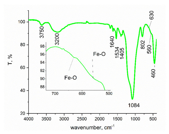 In the recorded spectrum can be evidenced the presence of two vibration bands located at 3750 and 3200 cm−1, which is associated with the presence of –OH groups. Bands located in the domain 1700–1400 cm−1 are specific for the presence of non-decomposed iron acetylacetonate. Additionally, from recorded spectra, there is the presence of the Si-O group, which is associated with the vibrations located at 1640, 1080, 800, and 460 cm−1 [55]. The weak band located between 630 and 560 cm−1 indicates the presence of Fe-O bonds, being possible to find such a band at 460 cm−1, it where can be overlapped with the presence of SiO2.