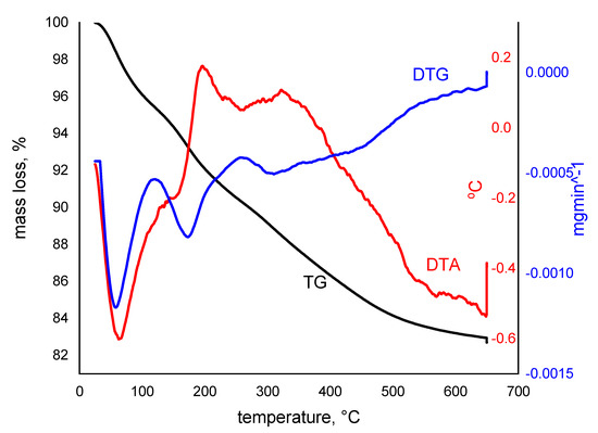Thermogravimetric analysis has been used to determine the system composition, thermal stability, and oxidative stability of prepared adsorbent material. The thermal decomposition kinetic, evaluation of material corrosive atmosphere, and volatile and water content have also been evaluated. In Figure 4, the recorded TG/DTG/DTA curves for SiO2FexOy are depicted.