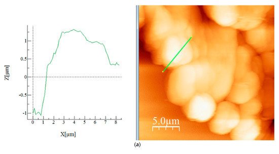 Topographical images on the selected areas showed the presence of a porous surface which is visible by the asperities on the graphs. Since the analysed sample on 5 × 5 µm is a close-up image, the mentioned asperities are more pronounced. More details regarding this aspect is discussed in the roughness section.